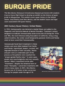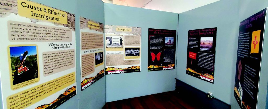 The exhibit design program offers a unique and transformative experience for high school students, blending academic rigor with creative expression and practical application. The semester-long journey fosters intellectual growth, collaboration, and a sense of accomplishment, giving students a lasting appreciation for the art of storytelling through exhibits and the impact of their work on the wider community. Student-designed exhibits have focused on topics such as the LGBTQ+ history of New Mexico, immigration and refugees, the Chicano movement, and Japanese American concentration camps in New Mexico during World War II.
